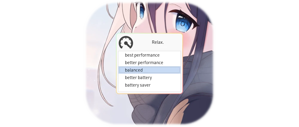 case "$(yad --title='Performance Management' --text='Relax.' \ --text-align=center --image=power-profile-performance-symbolic \ --buttons-layout=edge --no-buttons --fixed --width=220 --height=220 --list \ --separator='' --column='Energy Performance Policy' --no-headers \ 'best performance' 'better performance' 'balanced' 'better battery' \ 'battery saver')" in 'best performance') policy=performance ;; 'better performance') policy=balance-performance ;; 'balanced') policy=default ;; 'better battery') policy=balance-power ;; 'battery saver') policy=power ;; *) echo see you again.; exit ;; esac
