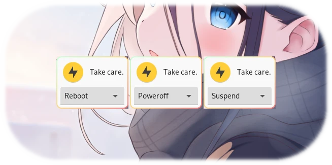 case "$(yad --title='Power Management' --text='Take care.' --text-align=center \ --image=org.xfce.powermanager --no-buttons --buttons-layout=spread --fixed \ --entry Poweroff Reboot Suspend)" in 'Poweroff') systemctl poweroff ;; 'Reboot') systemctl reboot ;; 'Suspend') systemctl suspend ;; *) echo see you again. ;; esac