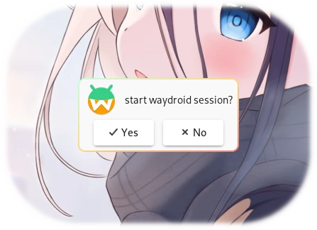 | if yad --title=Waydroid --text='start waydroid session?' --text-align=center \ --image=waydroid --buttons-layout=spread --fixed --button=yad-yes:0 \ --button=yad-no:1 ; then notify-send -i '/usr/share/icons/hicolor/512x512/apps/waydroid.png' Waydroid 'Session starting...' hyprctl dispatch exec -- waydroid session start fi