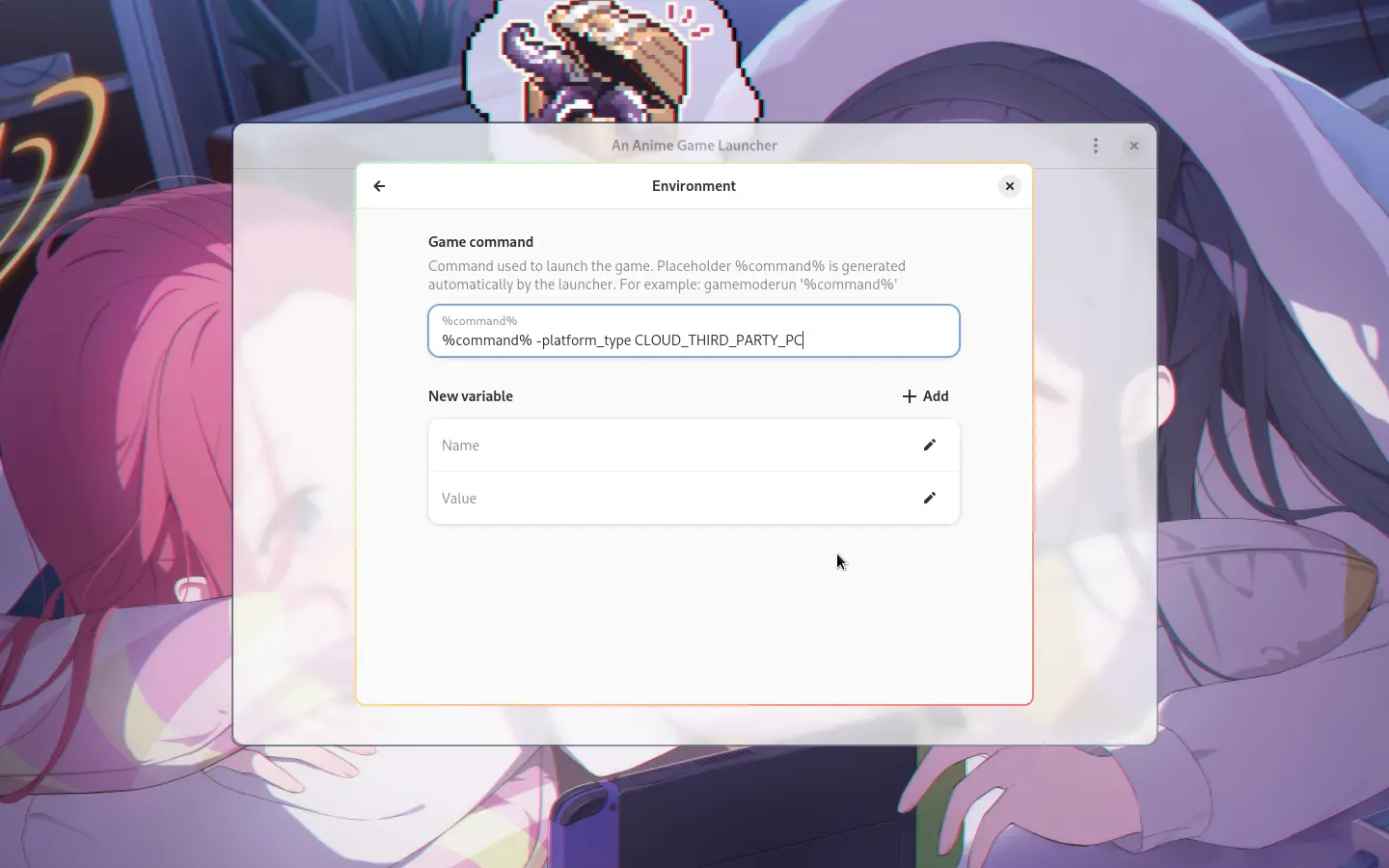 比如我用「An Anime Game Launcher」,进入设置->增强->环境 (Enhancements->Environment) ,把游戏命令 (Game command) 改成 %command% -platform_type CLOUD_THIRD_PARTY_PC :