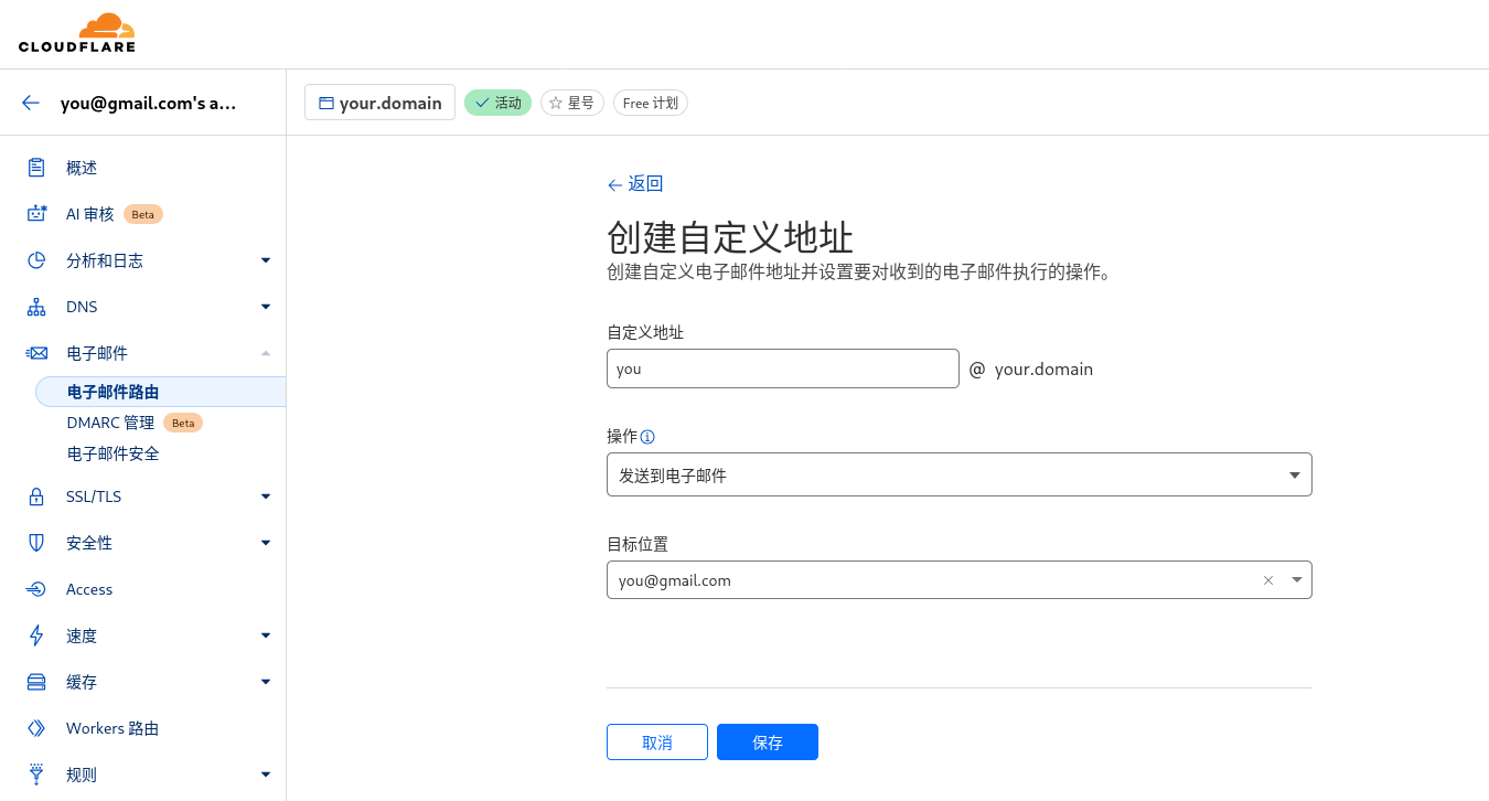 「自定义地址」填 you ,目标位置填 you@gmail.com ,然后一步一步按照 CloudFlare 的指示验证 you@gmail.com 是你的邮箱。