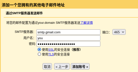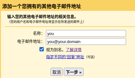 比如你的域名是 your.domain ,配置的邮箱地址为 you@your.domain ,实际收发邮件的 Gmail 邮箱为 you@gmail.com 。