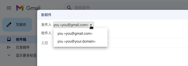 完成后使用 Gmail 发送邮件时可以选择使用 you@your.domain 作为发件人发送邮件: